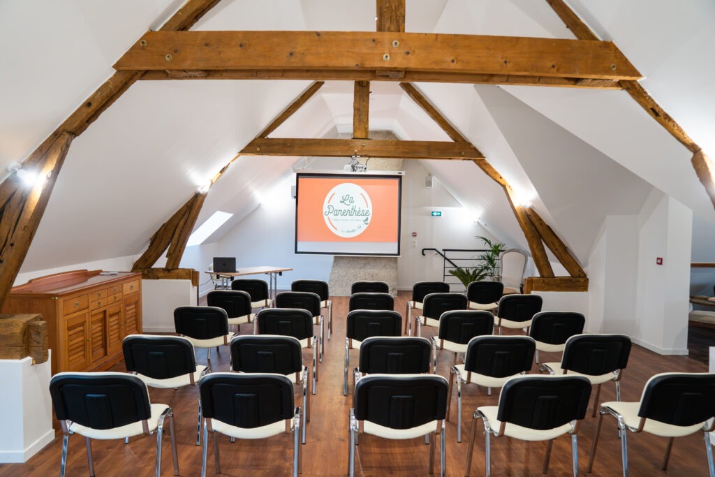 À La Parenthèse, nous avons imaginé un grand espace de réunion modulable sous une belle charpente apparente, baigné de lumière naturelle (mais pas trop) et parfaitement équipé pour vos sessions de travail.